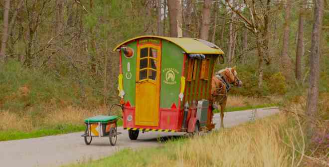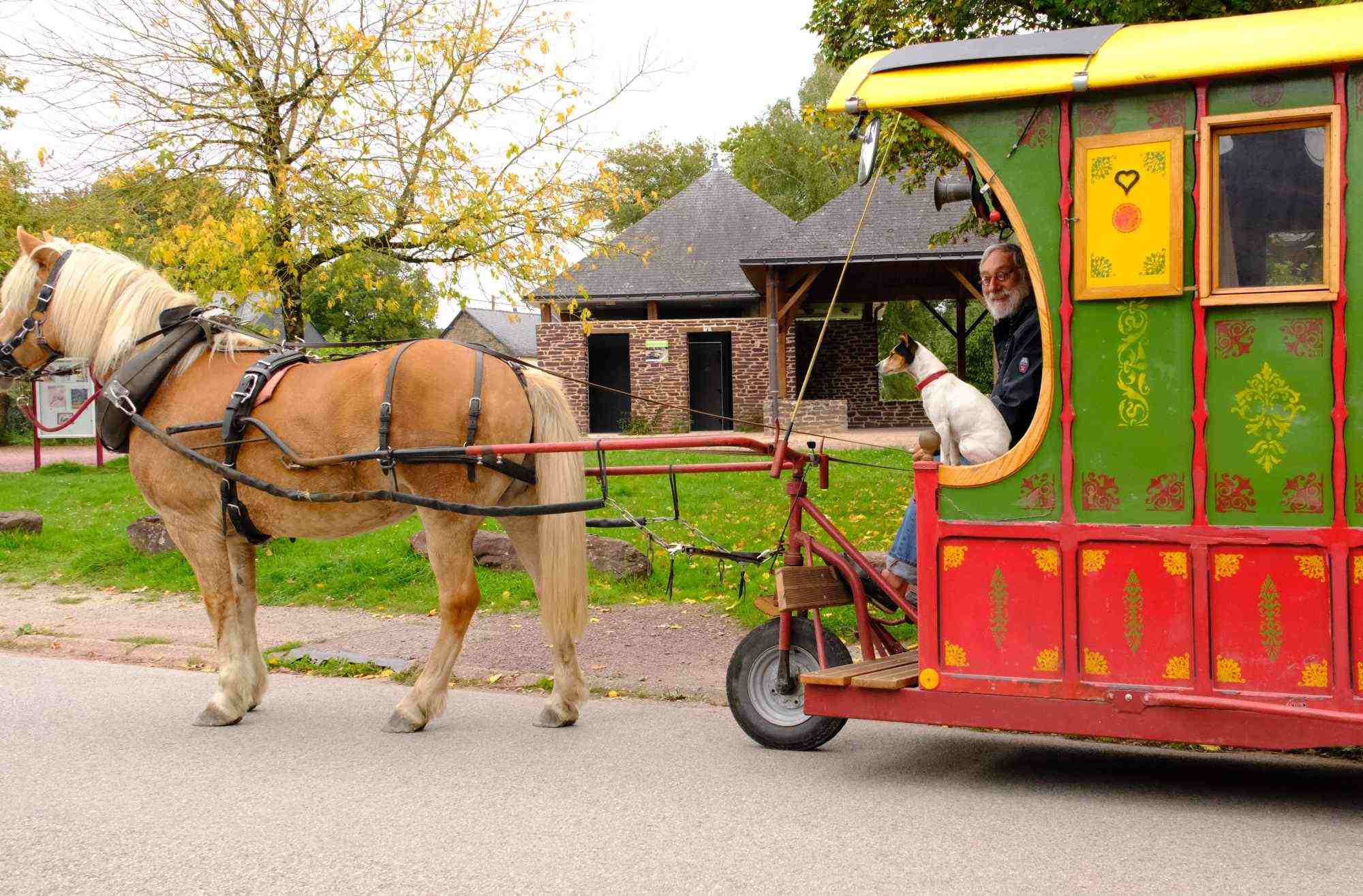 Ancien conservateur du musée de la musique mécanique de Dollon, Philippe Corbin a mis à profit la période du confinement pour fabriquer une jolie roulotte à trois roues, joyeusement colorée. Aujourd’hui, elle lui permet de voyager libre et léger, tracté par Anaëlle, son adorable ponette haflinger, et accompagné de son petit chien Jack Russel, absolument craquant. Il prend ainsi le temps de vivre et de voyager doucement, à contre-courant du tourisme express, loin des autoroutes et des sites trop fréquentés. Je les ai croisés plusieurs fois sur les petites routes de campagne dans la région de Tréhorenteuc, entre l’église du Saint-Graal et le Val sans retour…