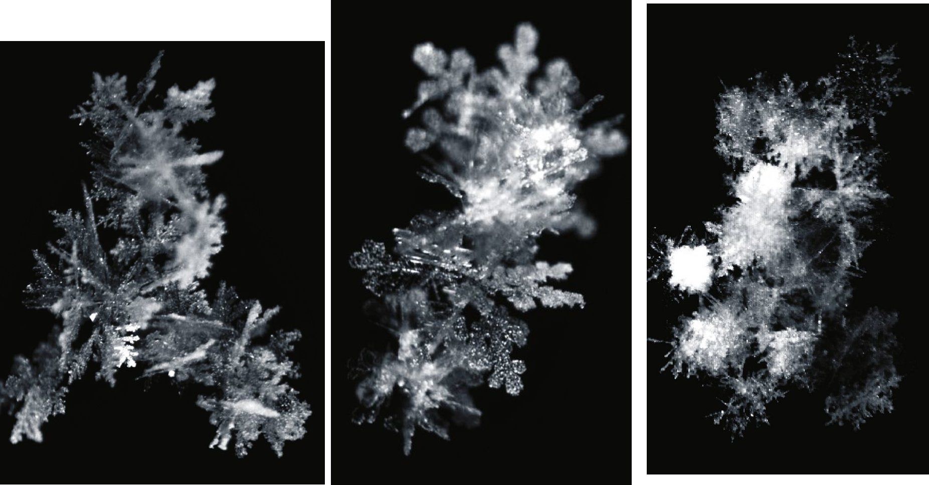 La plupart du temps, les flocons de neige ne sont pas de beaux cristaux solitaires de glace réguliers. En général, ce sont des agrégats assez complexes de cristaux, parfois recouverts de micro-gouttelettes glacées, qui tombent en abondance. La géométrie de ces formations fragiles est assez mal connue car il est difficile de les observer en plein vol avant qu’elles ne s’écrasent au sol, perdant ainsi une partie de leurs propriétés.